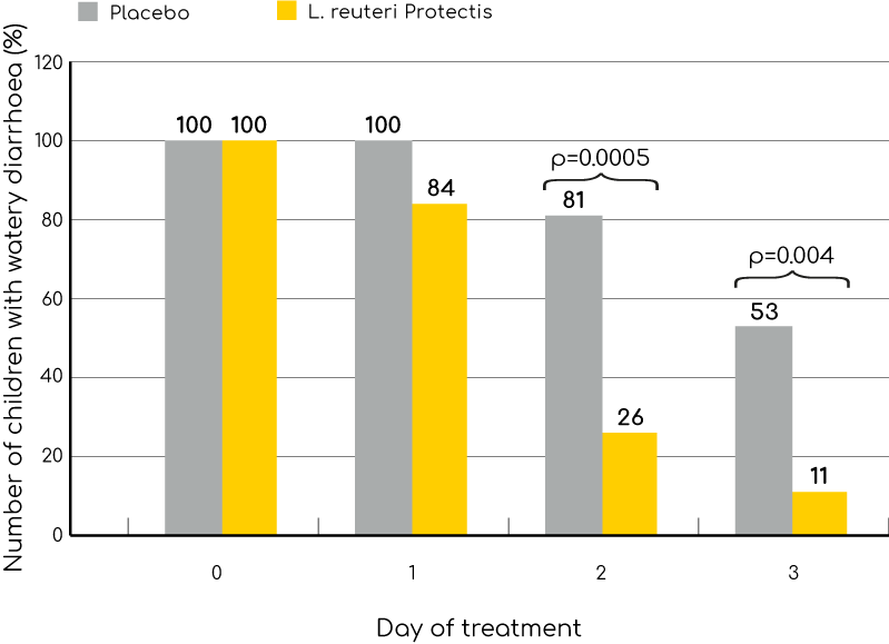 Amongst those Shornikova showed that after 2days of treatment with BioGaia 74 % of the patients have been free from watery diarrhoea and vomiting - published 1997 in the medical journal J. Pediatr. Gastroenterol. Nutr. Also the study from Francavilla published in 2012 showed the efficacy and safety of BioGaia Protectis while treating children with acute watery diarrhoea.