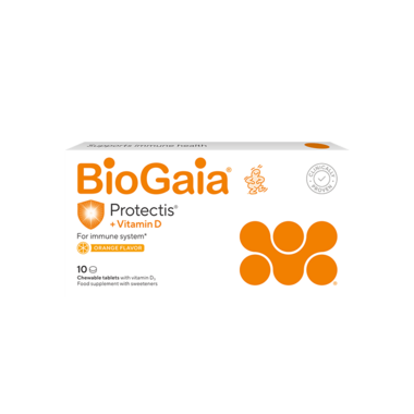 BioGaia Protectis košļājamās tabletes ar apelsīnu garšu ir uztura bagātinātājs, kas satur probiotisko baktēriju celmu Limosilactobacillus reuteri Protectis un D vitamīnu.